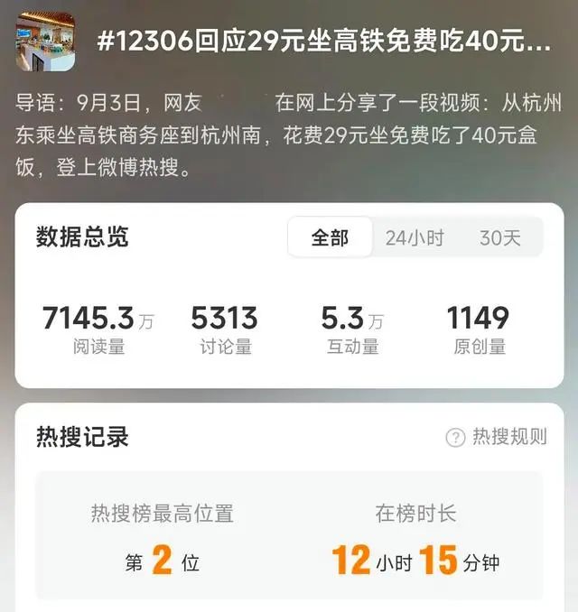 对此,12306客服表示确有此事,只要是在午餐时间11:30到13:00,晚餐时间17:30到19:00的放饭时间段内,且车次是跨局列车(始发站和终点站需是两个车局的),无论车程多短,都可以享受免费餐食一份。随后,#12306回应29元坐高铁免费吃40元盒饭#冲上热搜。